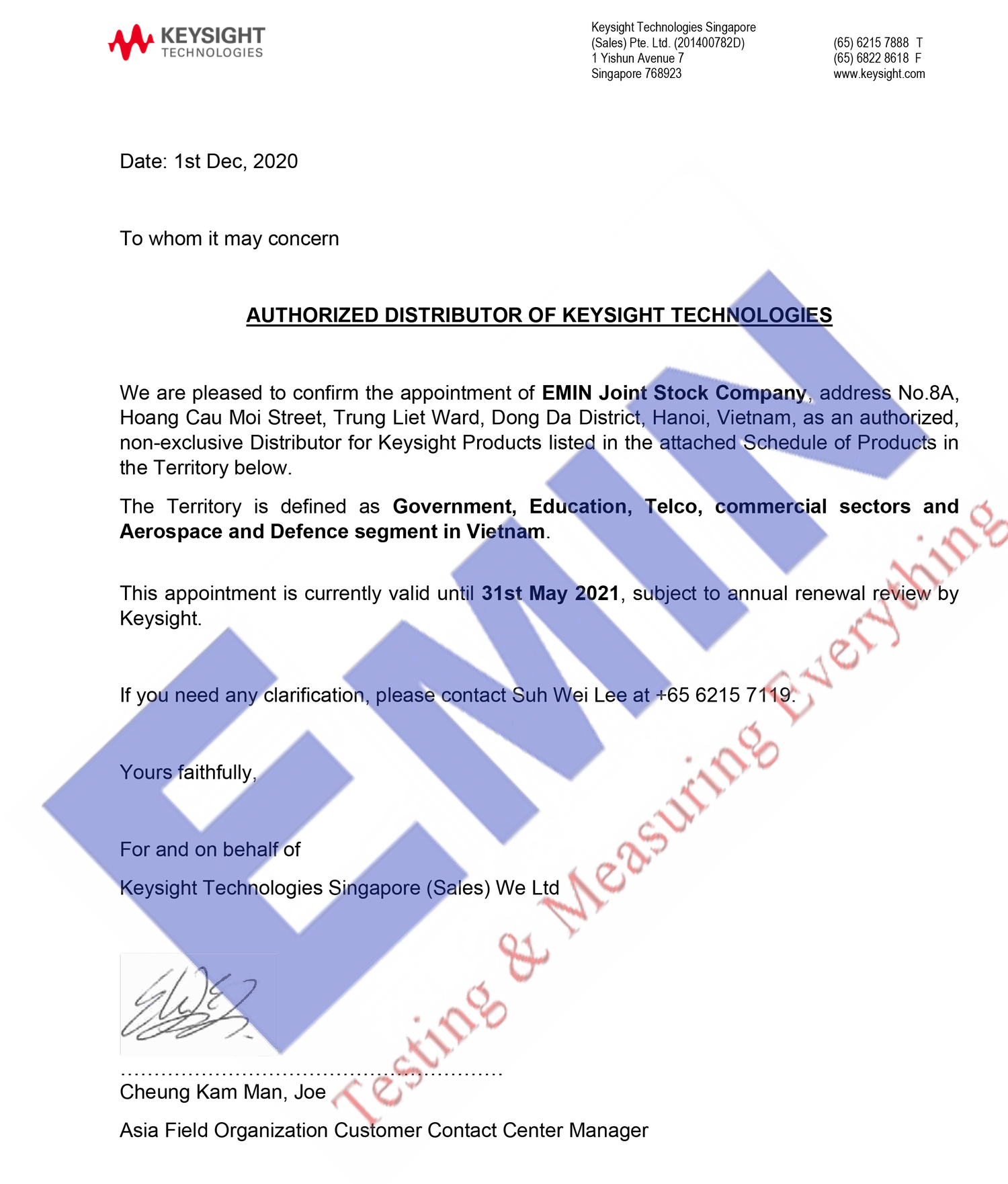 We are pleasure to announce that EMIN officially become Keysight's Authorized Distributor in Vietnam since November 2020